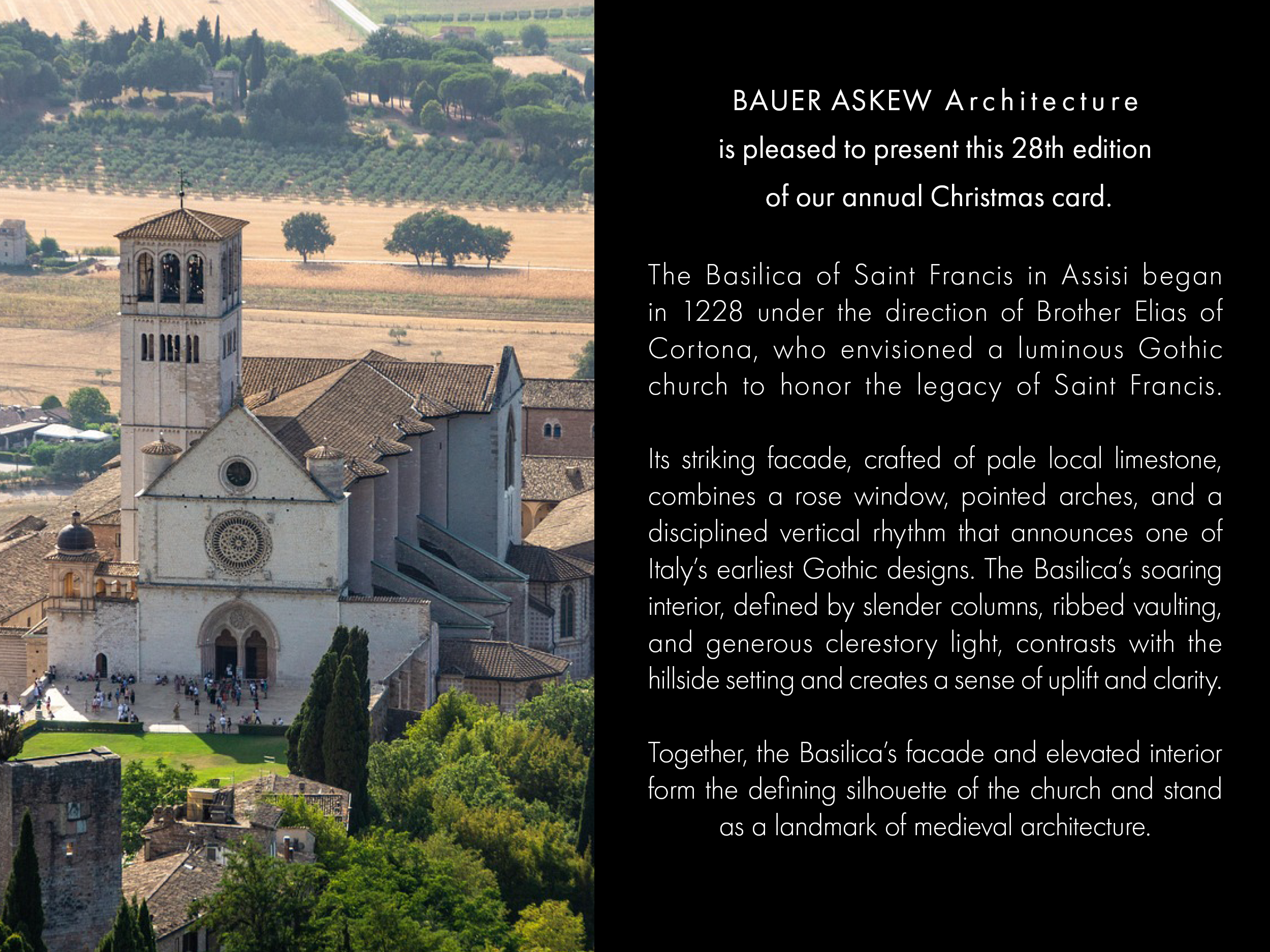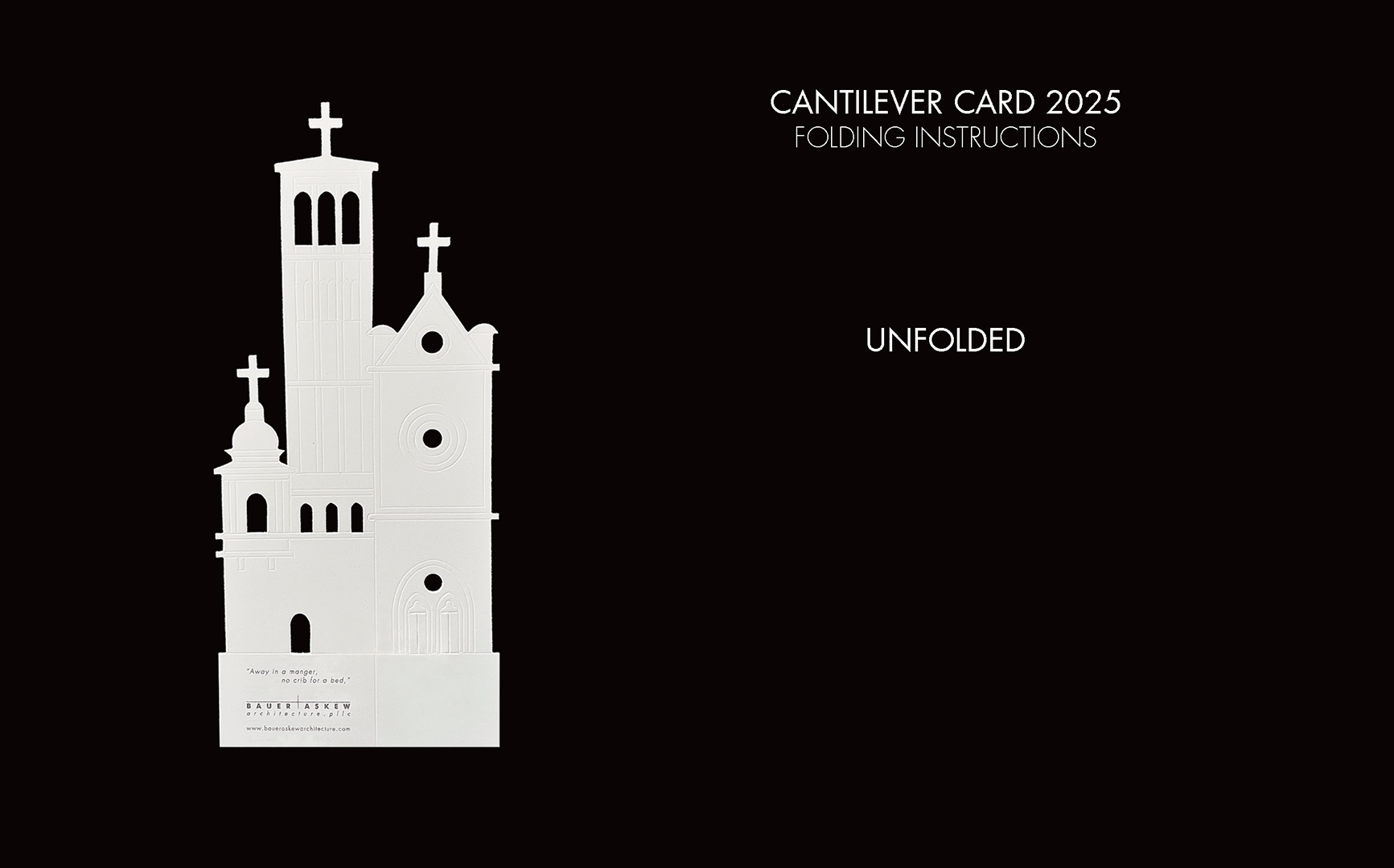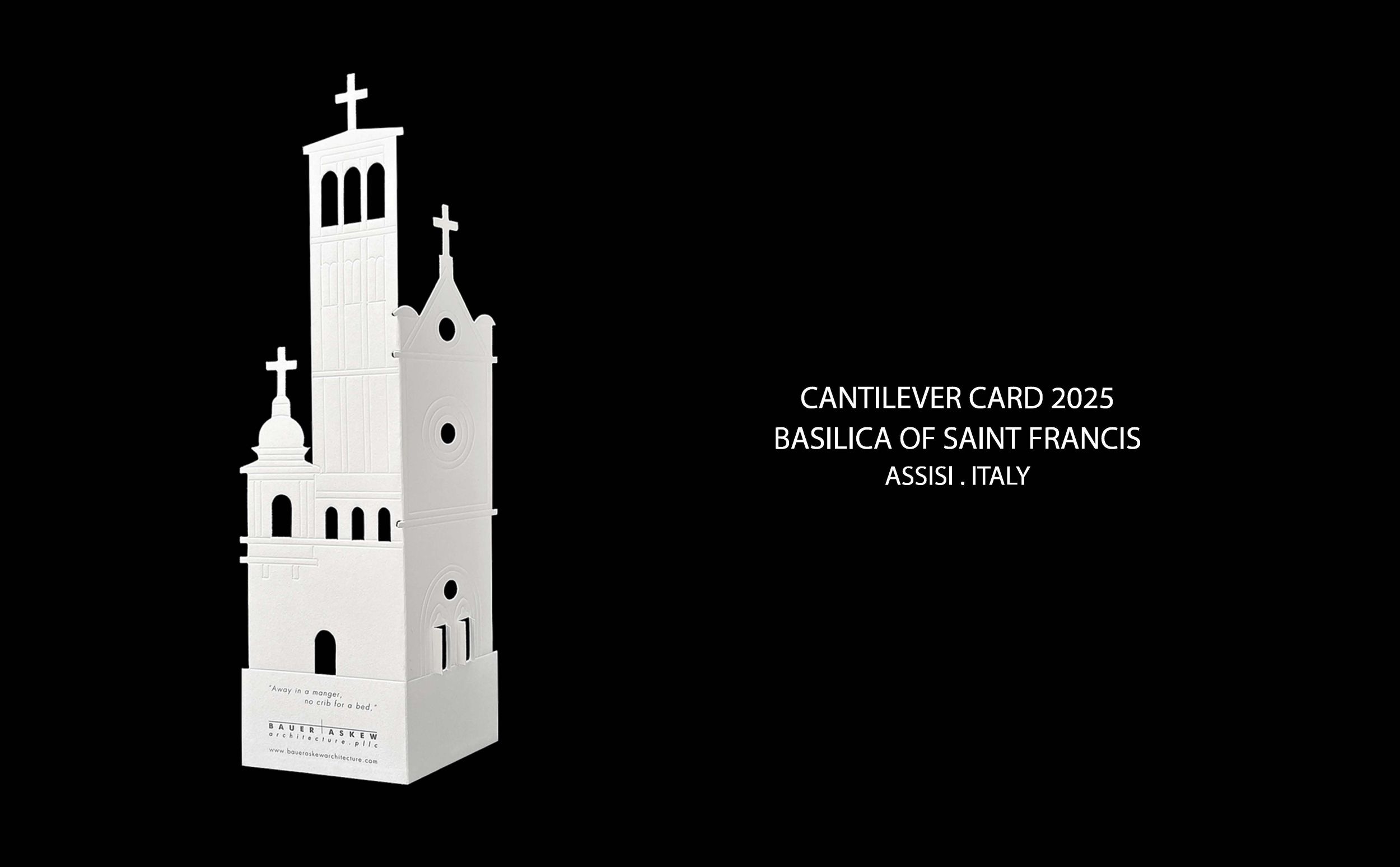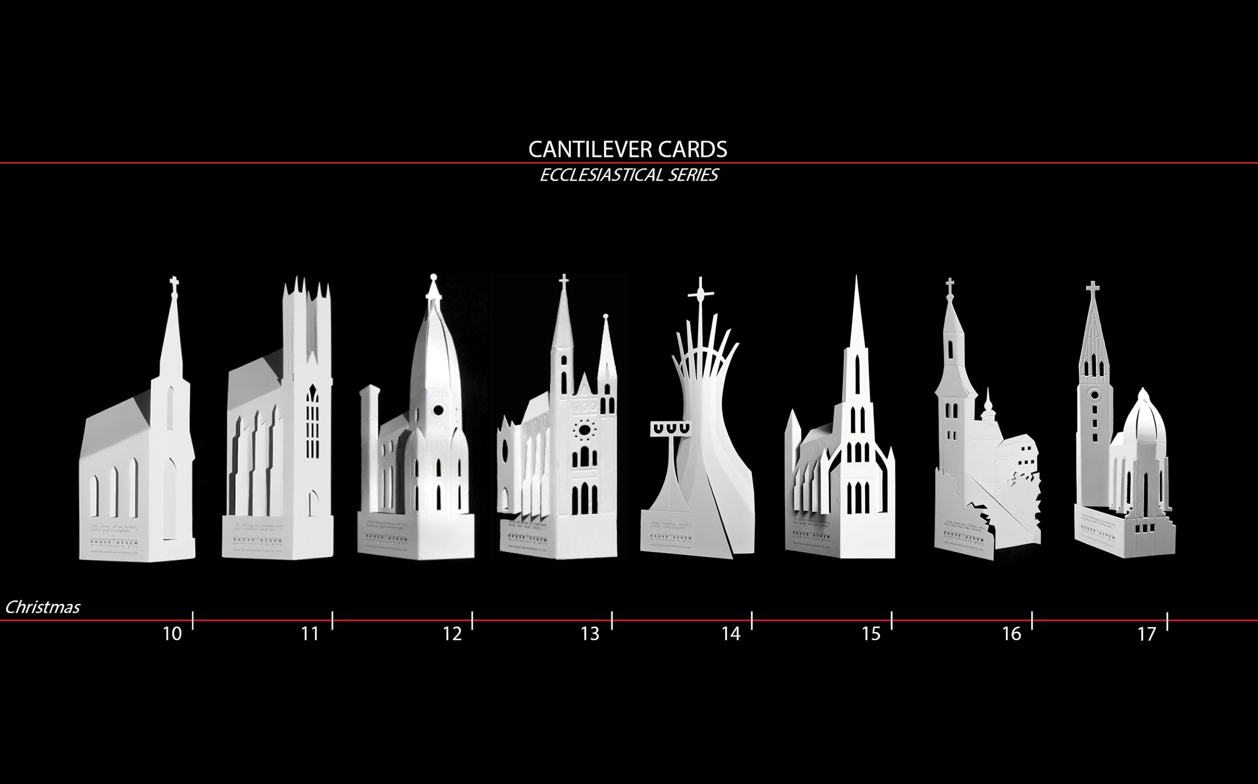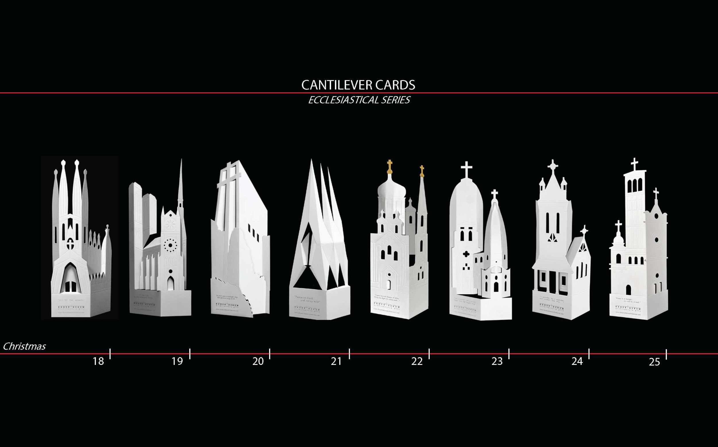 During the past twenty – eight years, our architecture firm has created distinctive Christmastime greeting cards. The design originates with a singular white card. Abstracted symbols of the season are die-cut, scored, and folded. A phrase from an appropriate, traditional Christmas song is included as the greeting. Over the course of the last fourteen years, we have focused on abstracting the grand cathedrals and churches of the world to create the Ecclesiastical Series.
